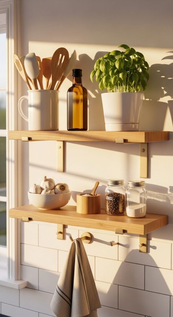 Floating shelves in the kitchen are one of the most versatile and beautiful kitchen storage solutions available because they add storage, display space, and decorative character to any empty wall without taking up a single inch of valuable floor or counter space. A pair of floating shelves in natural wood or white painted wood on a bare kitchen wall can completely transform that wall from plain and forgettable to warm and beautifully styled.
