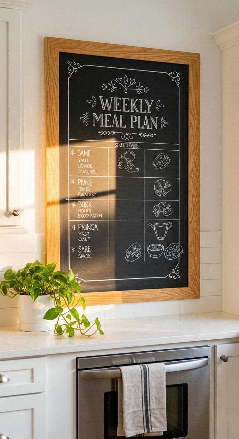 A chalkboard mounted on the kitchen wall is one of the most charming and functional kitchen decor accessories you can add to your cooking space. You can use it to write your weekly meal plan, a grocery list, a favorite recipe, an inspiring quote, or simply the day’s menu. It adds a personalized and ever-changing decorative element to the kitchen that feels warm, creative, and full of life.