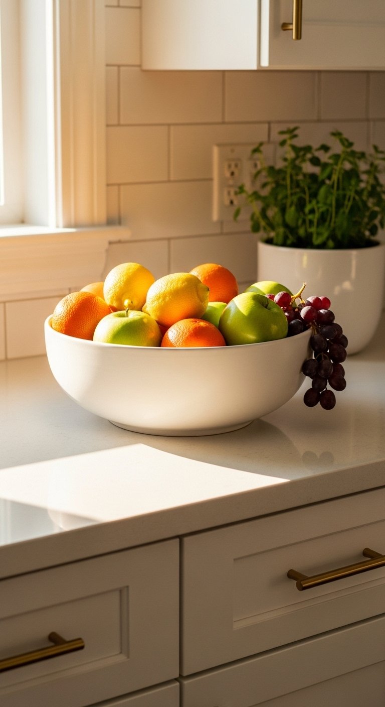 Choose a bowl in a material and color that complements your kitchen style. A white ceramic bowl works beautifully in a modern farmhouse kitchen, a natural wood bowl feels warm and organic, and a woven rattan bowl adds a relaxed coastal or boho farmhouse touch. Fill it with lemons, limes, apples, or oranges depending on the season for a pop of fresh color that also smells wonderful. It is one of the most effortless and budget friendly cozy kitchen decorating tips you will ever use.