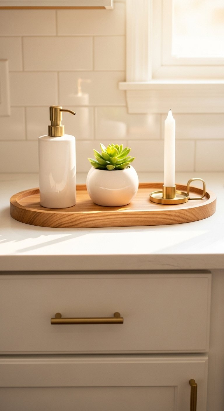 Choose a tray in natural wood, white ceramic, marble effect, or brushed gold metal to suit your kitchen style. Style it with your soap dispenser, a small plant, a candle, and one or two other small items that you use every day. Keep the tray on the counter beside the sink or on the kitchen island as a permanent styled moment. This is one of those stylish and functional kitchen decor ideas that costs very little but makes the kitchen look like it was designed by a professional.