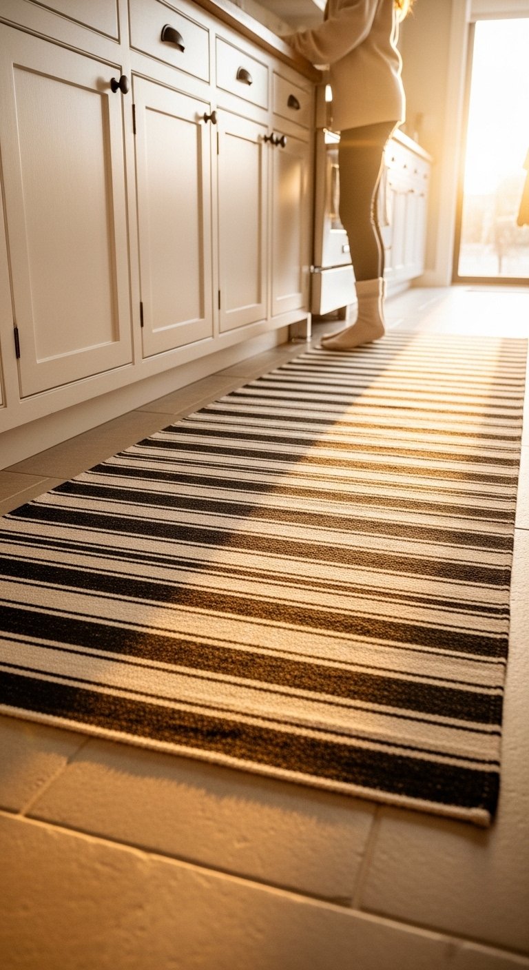 A long kitchen runner rug laid on the floor in front of your sink or stove is one of the most overlooked and underrated stylish and functional kitchen decor ideas you can try. It adds warmth, color, pattern, and cushioning to the hardest working area of your kitchen floor and makes standing while cooking and doing dishes significantly more comfortable. A beautiful runner also adds a strong decorative element to the kitchen that pulls the whole room together.