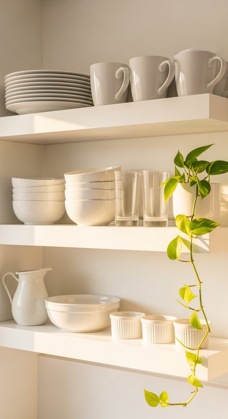 You do not need a matching full set to make this work. A collection of white dishes in slightly different shapes and sizes from different sources looks charming and curated when displayed together. Add a few open shelves to an empty wall and stack your prettiest plates, bowls, and mugs there. This is one of the most beautiful open shelving kitchen ideas because it turns your everyday dishes into genuine kitchen decor that costs you absolutely nothing extra.