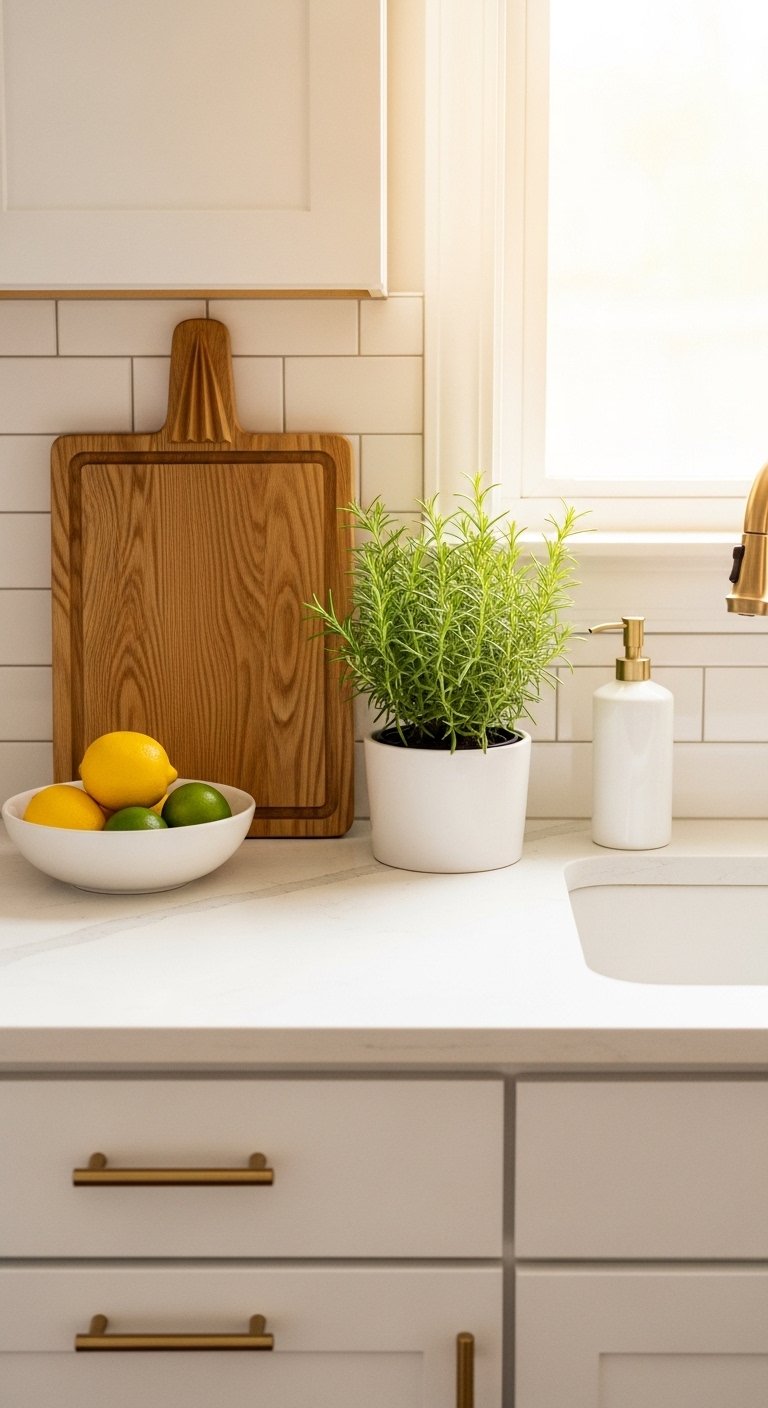 Keep only the items you use every single day on the counter and put everything else away. A wooden cutting board leaned against the backsplash, a small potted herb in a white ceramic pot, a clean fruit bowl, and a simple soap dispenser beside the sink is all you need. These items are functional every day and also look beautiful together. Less is always more on a kitchen counter and a clean surface makes the whole room feel calmer and more spacious.