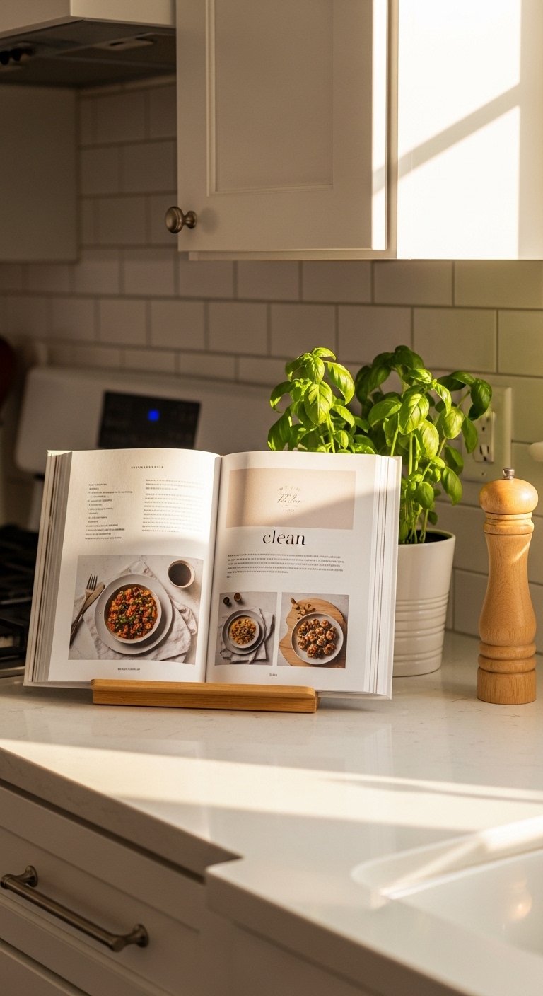 A beautiful hardcover cookbook displayed openly on your counter or on a kitchen shelf is one of the most charming and unexpected kitchen decor accessories you can add to your space. It adds color, texture, and personality to the kitchen while also being completely useful and practical every single time you cook. A cookbook with a beautiful cover propped up on a simple wooden book stand beside your stove or on an open shelf looks like a thoughtful and intentional design choice.