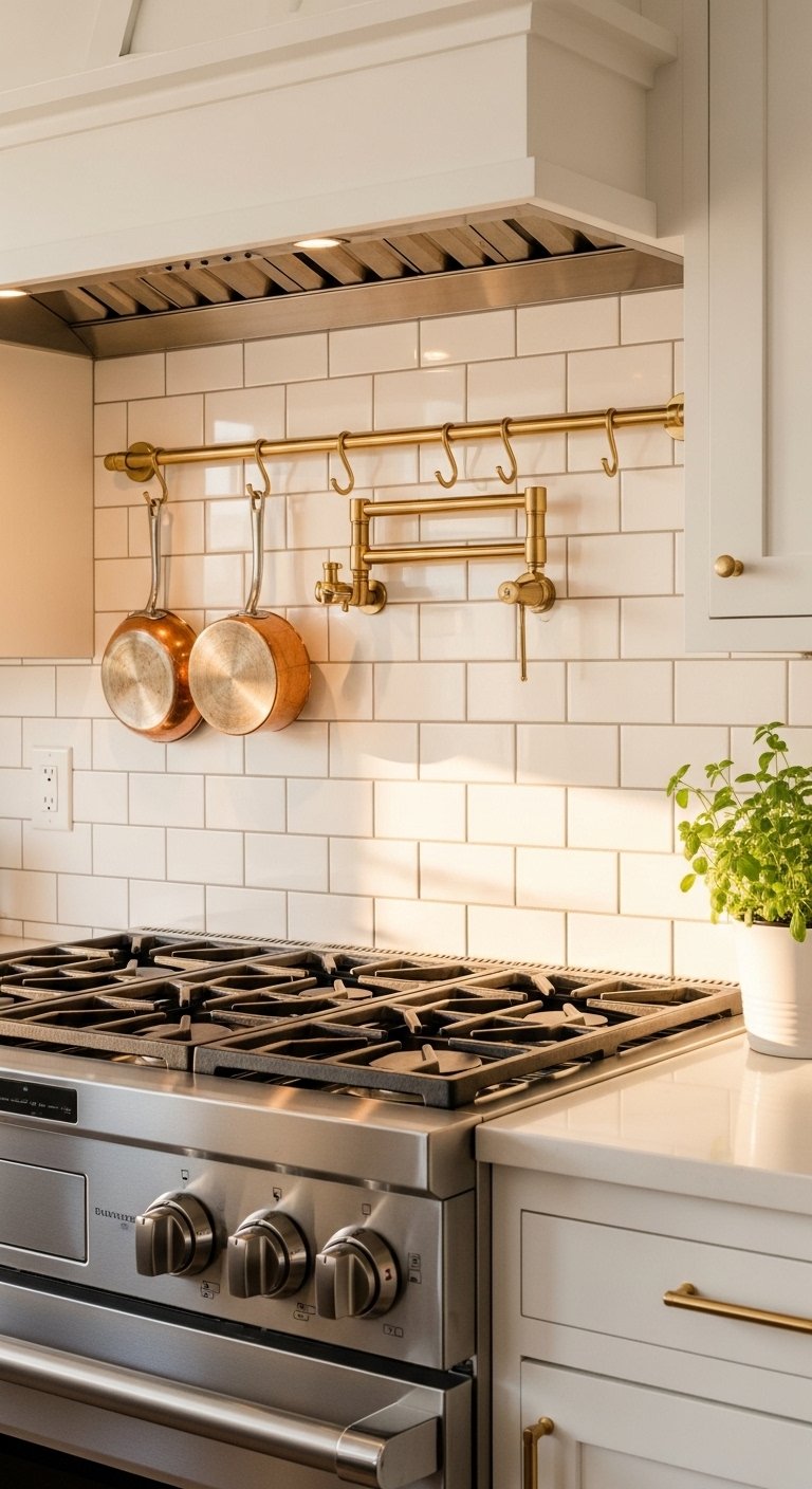 A ceiling mounted pot rack in brushed gold, matte black, or brushed nickel instantly gives the kitchen a professional and intentional look that feels both stylish and incredibly practical. You can also hang a wall mounted pot rail with hooks above the stove if a ceiling rack is not an option in your space. Either way this is one of the most effective stylish and functional kitchen decor ideas you will find and it works in kitchens of every size and style.