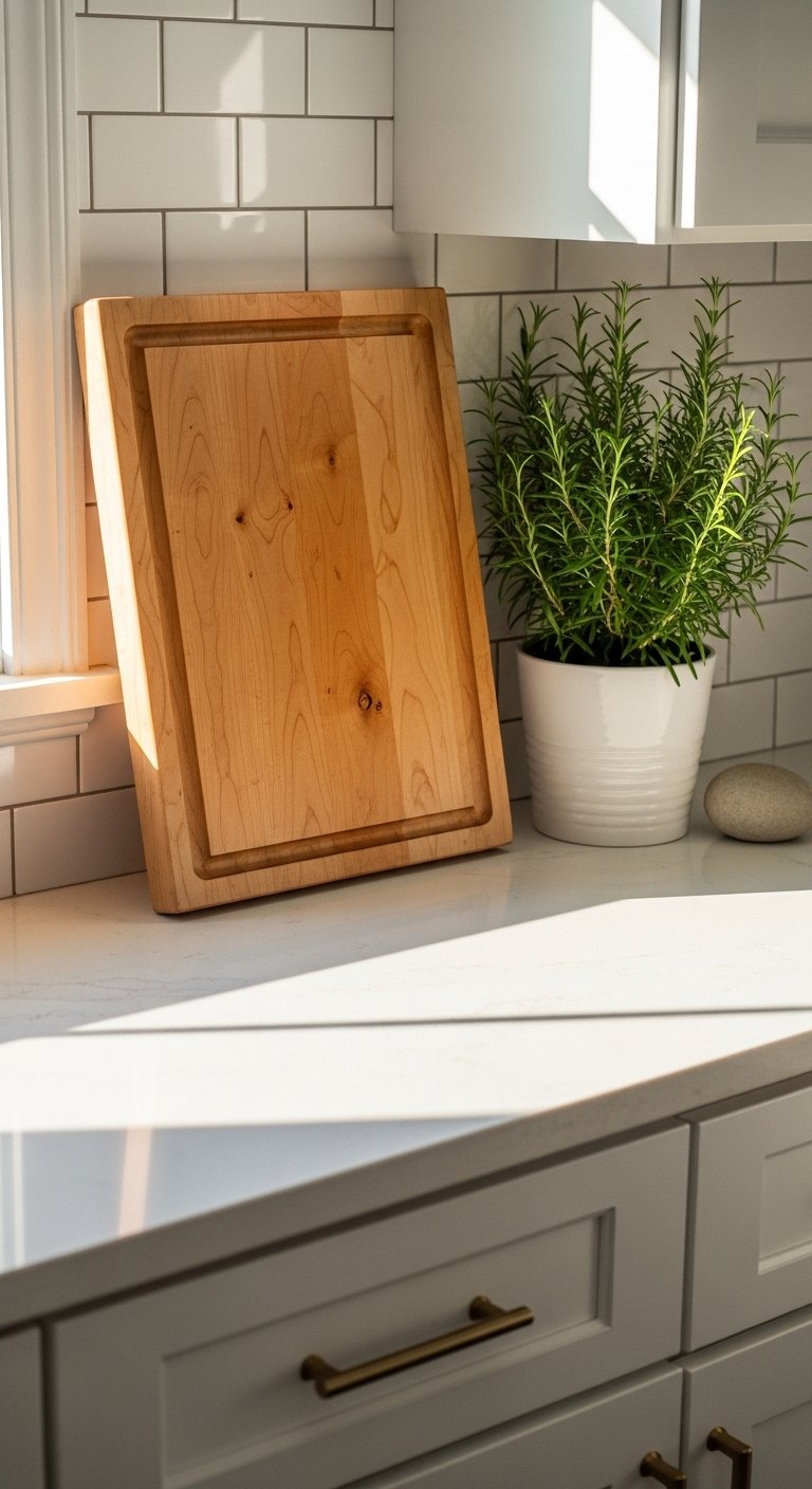 Choose a cutting board in a natural light wood like maple, bamboo, or acacia for a warm and organic look. A board with a juice groove around the edge and a handle cutout looks especially beautiful and intentional when displayed on the counter. This is one of those stylish and functional kitchen decor ideas where you genuinely cannot tell where the decor ends and the kitchen tool begins and that is exactly what makes it so perfect.