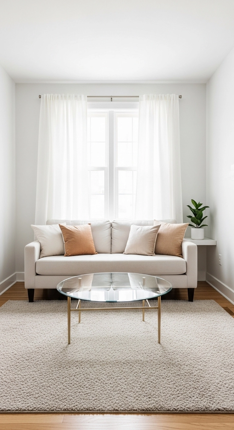 A rug in a small living room can either open the space up or close it in, depending on the color and size you pick. A light-colored rug in cream, soft white, or warm beige keeps the floor feeling open and adds a sense of calm to the room. Dark or very busy rugs tend to make a small space feel cluttered and heavy.