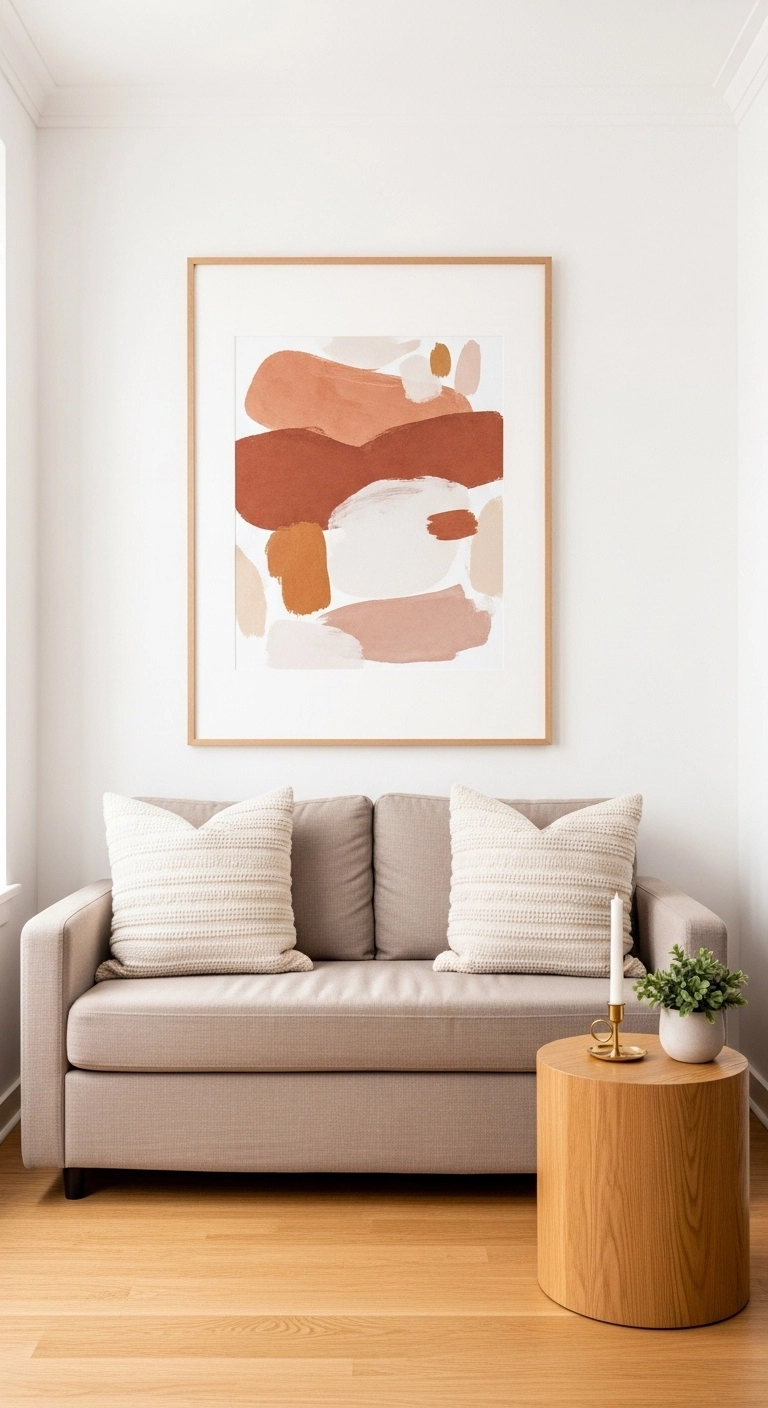 Choose one big print or canvas instead of a bunch of small frames scattered around. A large piece in soft neutral tones or simple black and white works beautifully in most cozy small living room styles. Keep the rest of the walls clear so the art can breathe and do its job. This is one of those tiny living room decorating ideas that looks expensive but does not have to be.