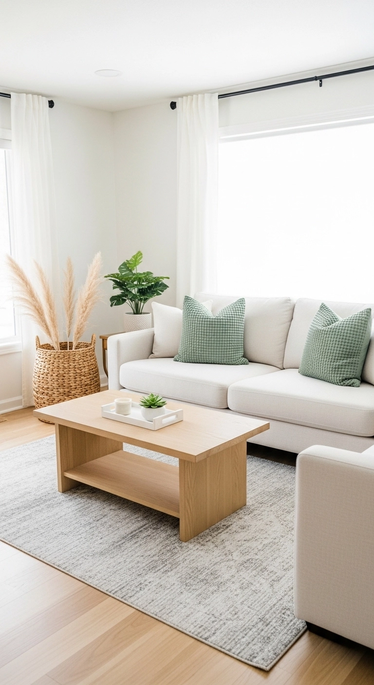 A great starting point is a base of soft white or warm beige, paired with one natural accent like sage green or dusty blue, and one neutral texture like natural wood or woven rattan. This kind of palette feels fresh, cohesive, and intentional. Every item in the room will look like it belongs, which automatically makes the whole space feel more open and put together.