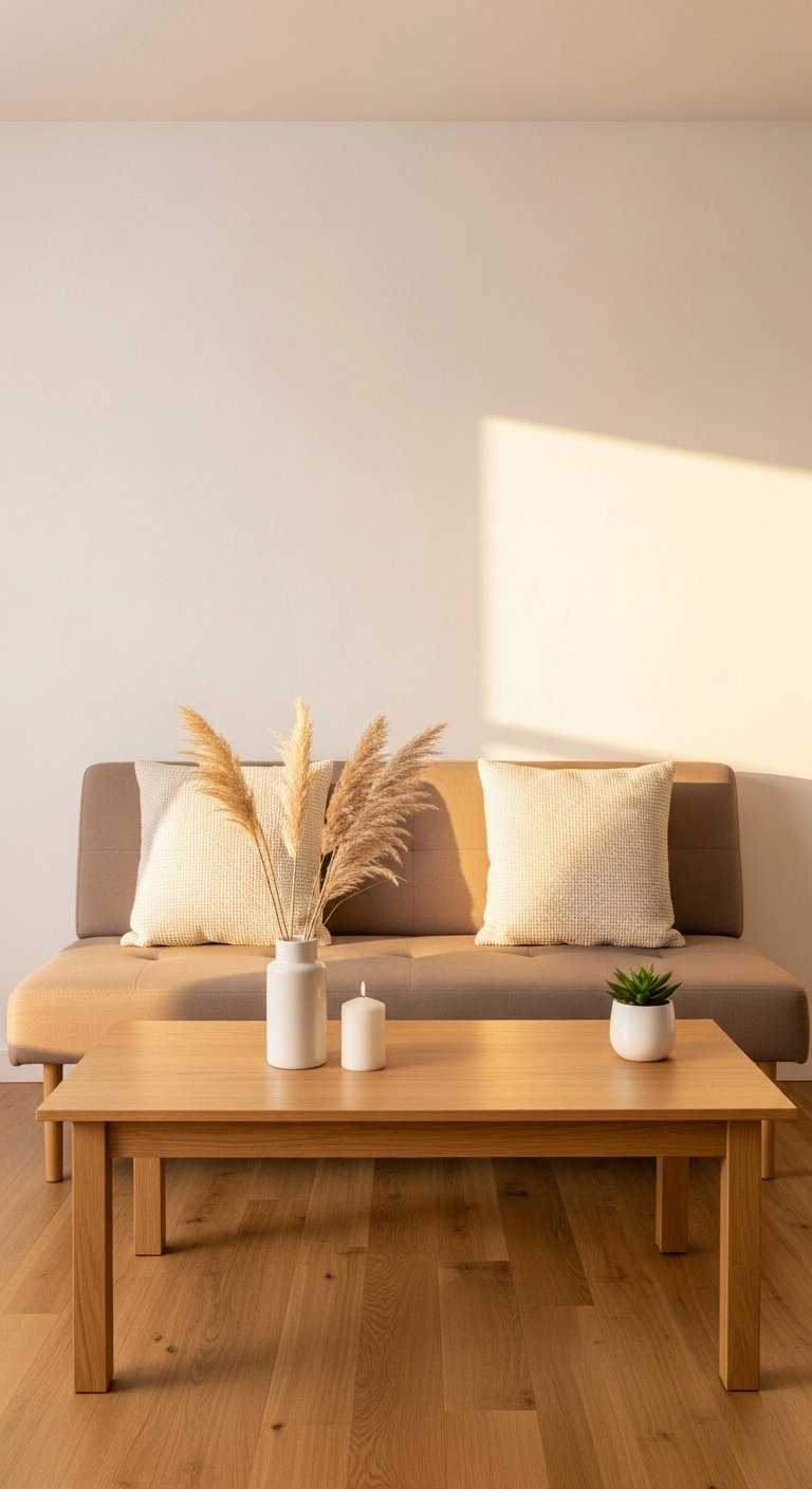 Choose two or three meaningful decorative pieces and let them breathe with space around them. A single vase with fresh stems, one candle, and a small tray on the coffee table is all you need. Putting things away and keeping surfaces clear makes the whole room feel calmer, bigger, and more put-together without spending a single dollar.