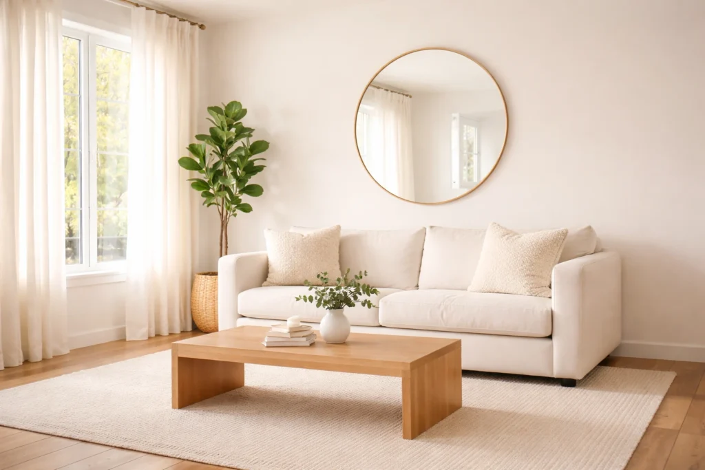 Choose two or three meaningful decorative pieces and let them breathe with space around them. A single vase with fresh stems, one candle, and a small tray on the coffee table is all you need. Putting things away and keeping surfaces clear makes the whole room feel calmer, bigger, and more put-together without spending a single dollar.
